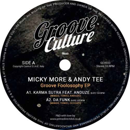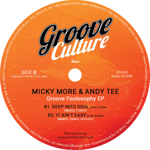 Track Listing:Groove Foolosophy, the new Ep of Micky More & Andy Tee. Incl. 4 tracks, on side A we find "Karma Sutra" and "Da Funk". On Side B: "Deep Into Soul" and "It Ain't Easy". We can say that side A is more soul funk disco vibes while Side B is more classic Deep House. All tracks here are produced with a touch of class where musicians play a fundamental role and create an organic groove. The quality you expect from the Italian duo.